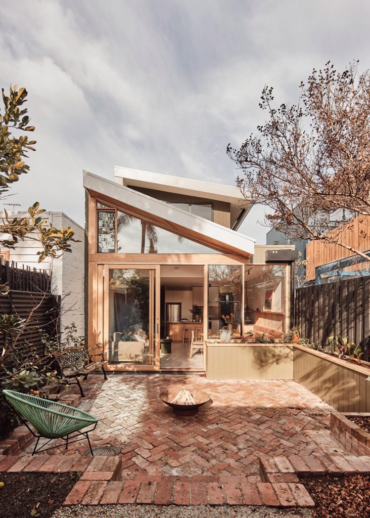 Możesz też, tak jak w poniższym projekcie, wykorzystać różne ponadczasowe materiały i wzory. Co powiesz na zastosowanie w wnętrzu posadzki dekoracyjnej Terrazzo, a na tarasie klasycznych czerwonych cegieł ułożonych w jodełkę? To połączenie będzie świetną bazą dla różnych aranżacji.